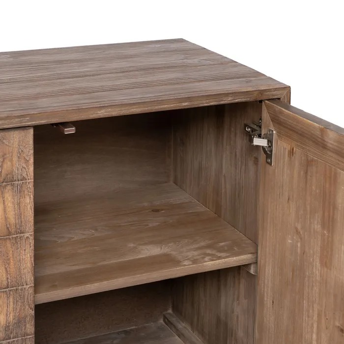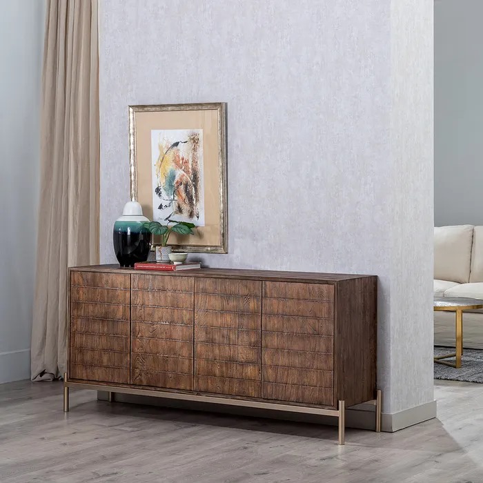 Aparador de diseño industrial con estructura robusta fabricada en madera reciclada de abeto y hierro. Su acabado en tono marrón realza la textura natural de la madera, mientras que el hierro aporta estabilidad y durabilidad. Cuenta con cuatro puertas con cierre push, ofreciendo un almacenamiento espacioso y funcional para cualquier estancia del hogar.