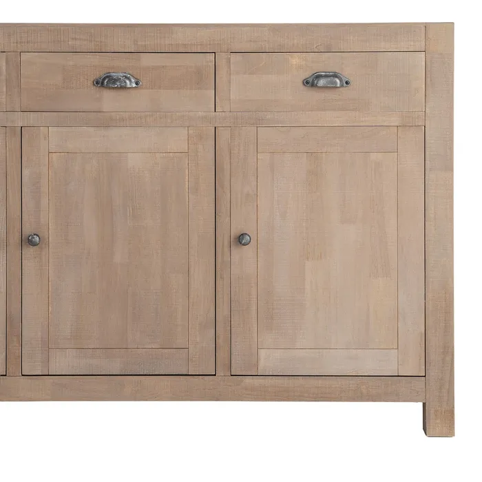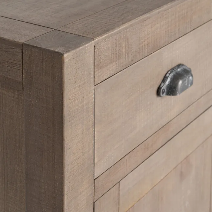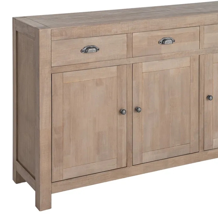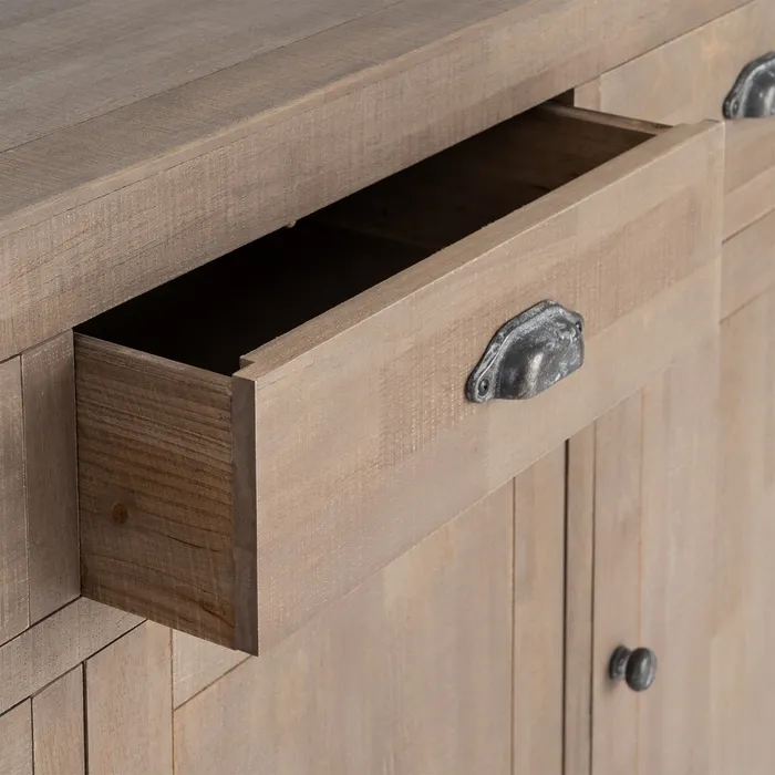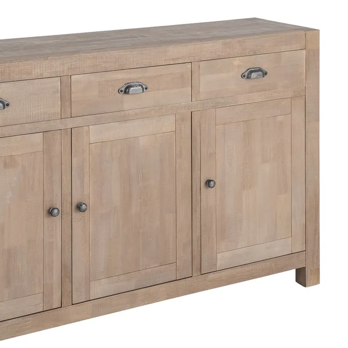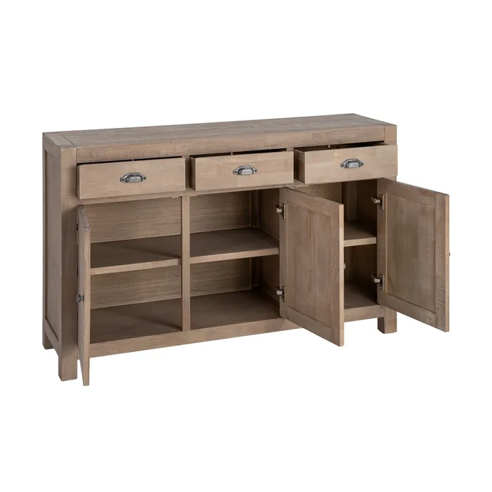 El aparador COTTAGE une capacidad y diseño atemporal. Su madera de pino en acabado natural aporta luminosidad y calidez al comedor o salón, ofreciendo un almacenaje práctico con mucho estilo. Cuanta con 3 cajones y 3 puertas que en su interior esta separado por una balda.