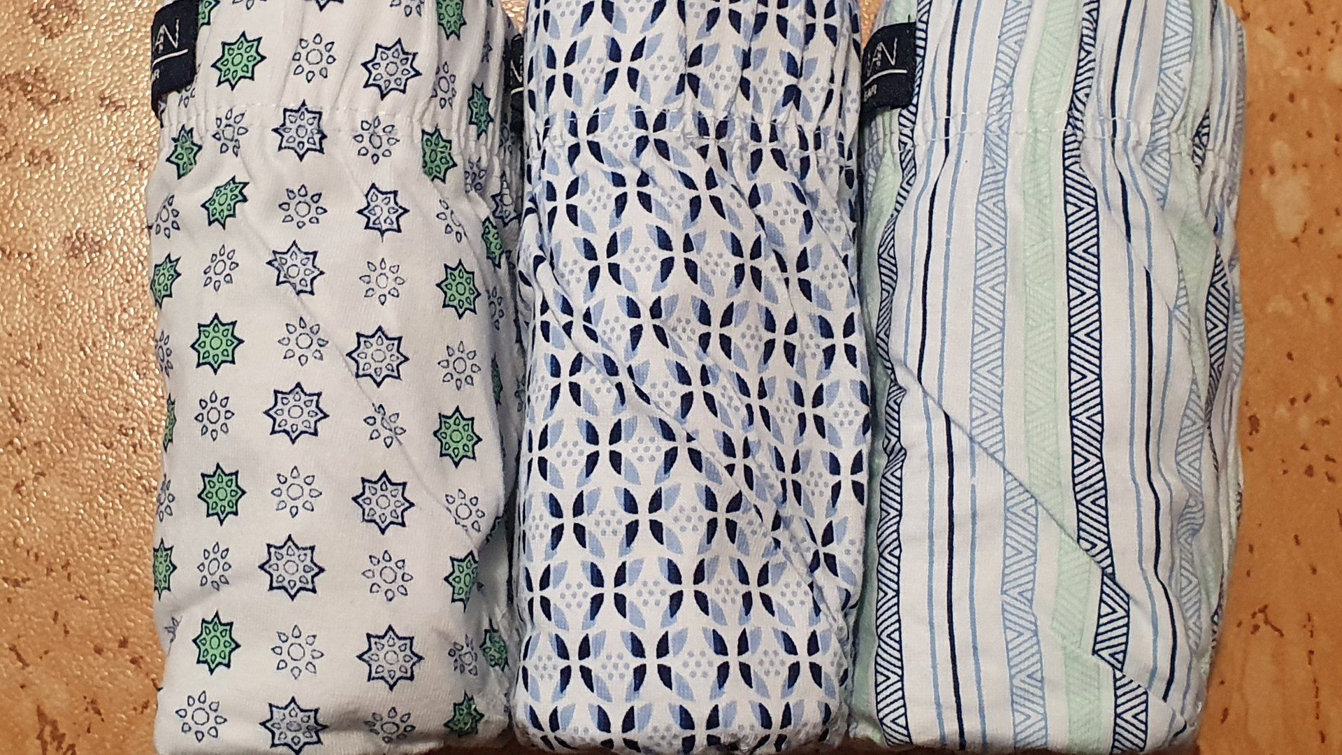 Pack de 3 slips cerrados con patrón clásico, confeccionados en algodón estampado, con diseños masculinos, en rayas, figuras geométricas, etc, sobre fondo blanco