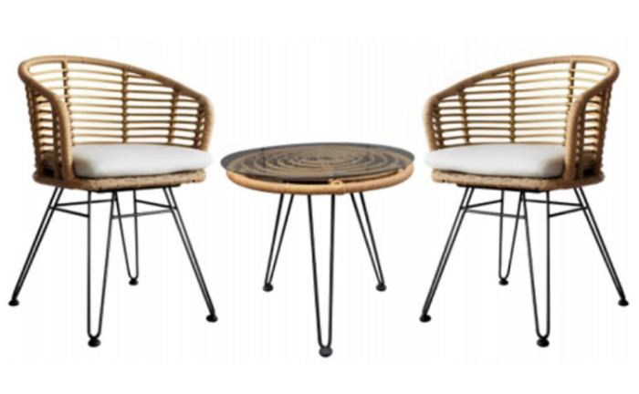 Tras un día entero de sol y playa, el atardecer trae consigo la promesa de la calma. Es el momento de recogerse, de reunirte con tus amigos en la calidez de tu terraza con el Conjunto de jardín con 2 sillones con terminación redonda en los brazos y mesa de centro en metal y ratán sintético Juliana.