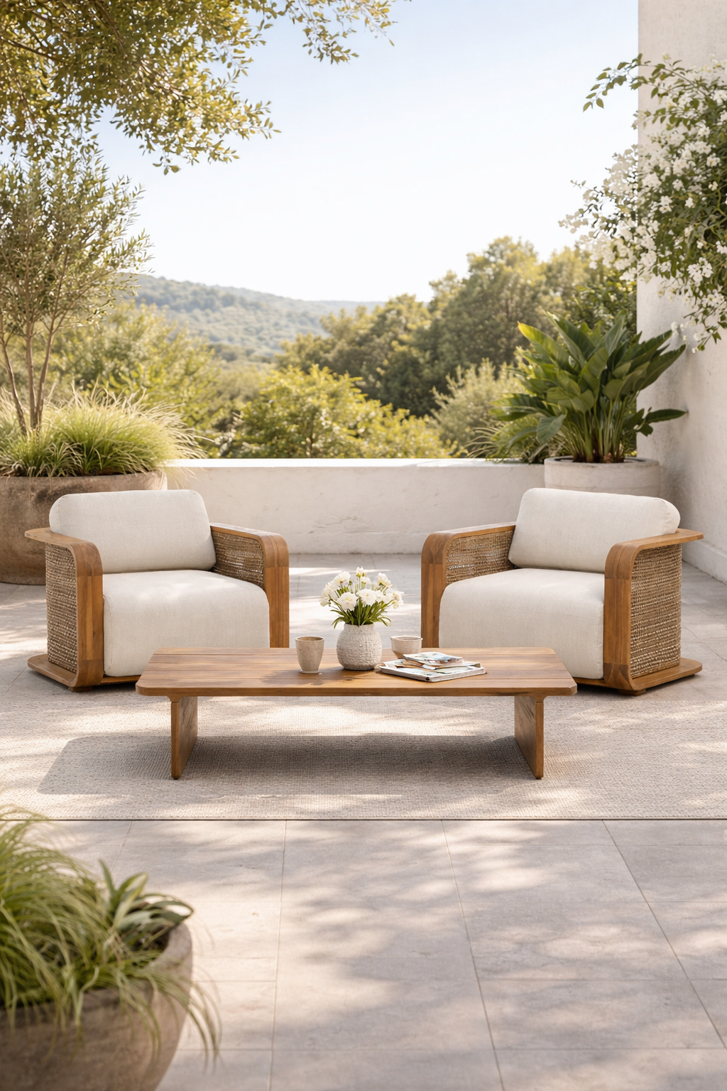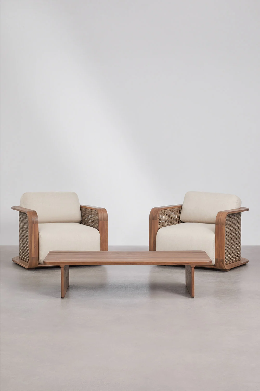Como un pequeño refugio de calma en medio del jardín, el Conjunto de jardín con 2 sillones y mesa de centro en madera de acacia está pensado para transformar cualquier espacio exterior en un oasis contemporáneo con alma natural. Su diseño, que fluye entre la pureza minimalista y la calidez tropical, destila la filosofía de los momentos compartidos. La mesa de centro, con su silueta rectangular y bordes suavemente redondeados, ha sido fabricada íntegramente en madera de acacia, a través de un entramado de finas lamas dispuestas en paralelo, añadiendo textura visual y permitiendo que la pieza dialogue con la naturaleza que la rodea. Los paneles verticales que conforman las patas transmiten estabilidad y una presencia sólida. Rodeando la mesa encontramos 2 sillones que se erigen como guardianes del confort. Con un volumen compacto y orgánico, sus esquinas suavemente curvadas y la elegancia del mimbre que decora sus laterales evocan las tardes de verano junto al mar. La madera de acacia, trabajada con un acabado al aceite que realza sus vetas naturales, abraza los generosos cojines tapizados en poliéster repelente al agua y resistente al sol. La doble capa de espuma con densidad 25 y 15 kg/m³, respectivamente, ofrece la suavidad de una nube, mientras que los reposabrazos, anchos y envolventes, invitan a dejarse caer en una postura relajada. Más que mobiliario, este conjunto es un escenario para la convivencia y el descanso, donde cada elemento ha sido diseñado para que el tiempo fluya sin prisa.