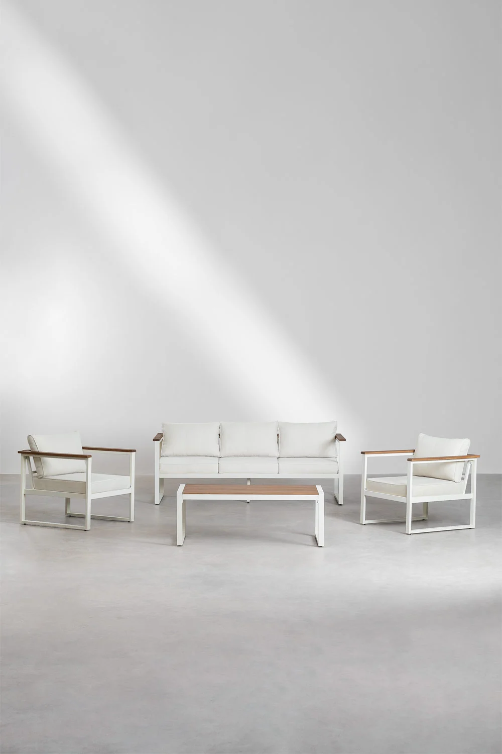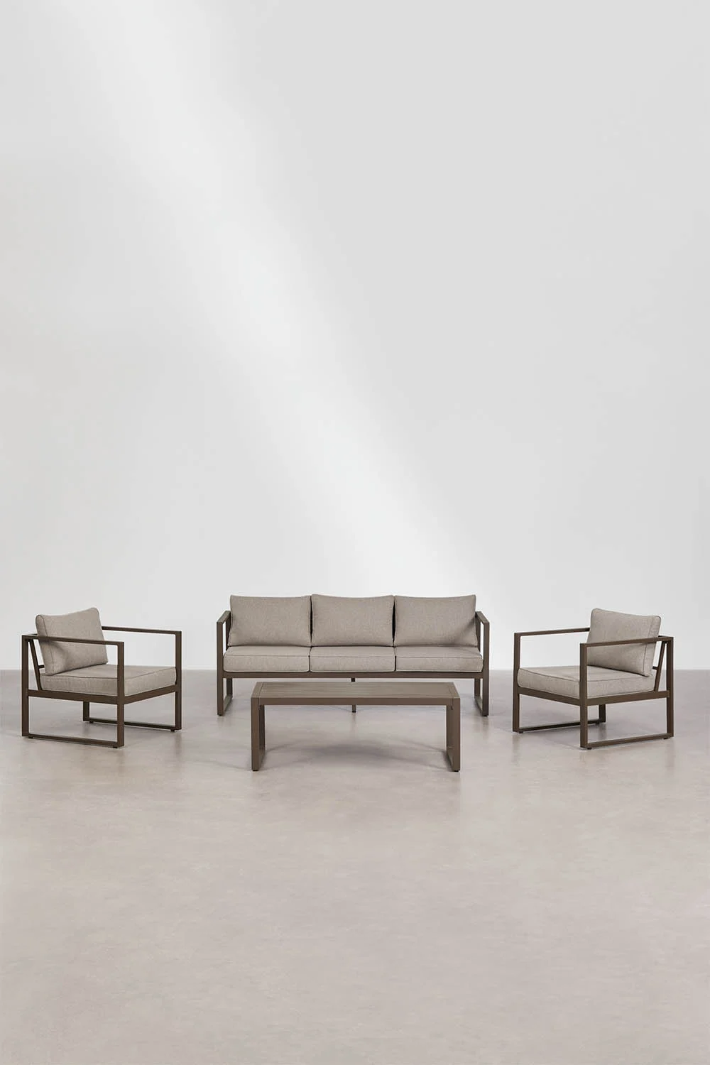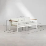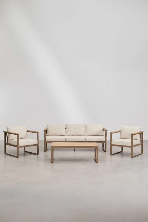 Este conjunto está formado por sofá de 3 plazas, 2 sillones individuales y mesa de centro, ofreciendo el equilibrio perfecto entre funcionalidad y confort. Su estructura de aluminio lo hace ligero, resistente y perfecto para exteriores, mientras que sus cojines acolchados aportan esa comodidad que invita a alargar cualquier sobremesa.