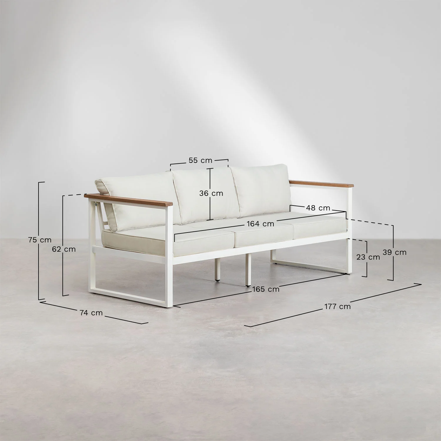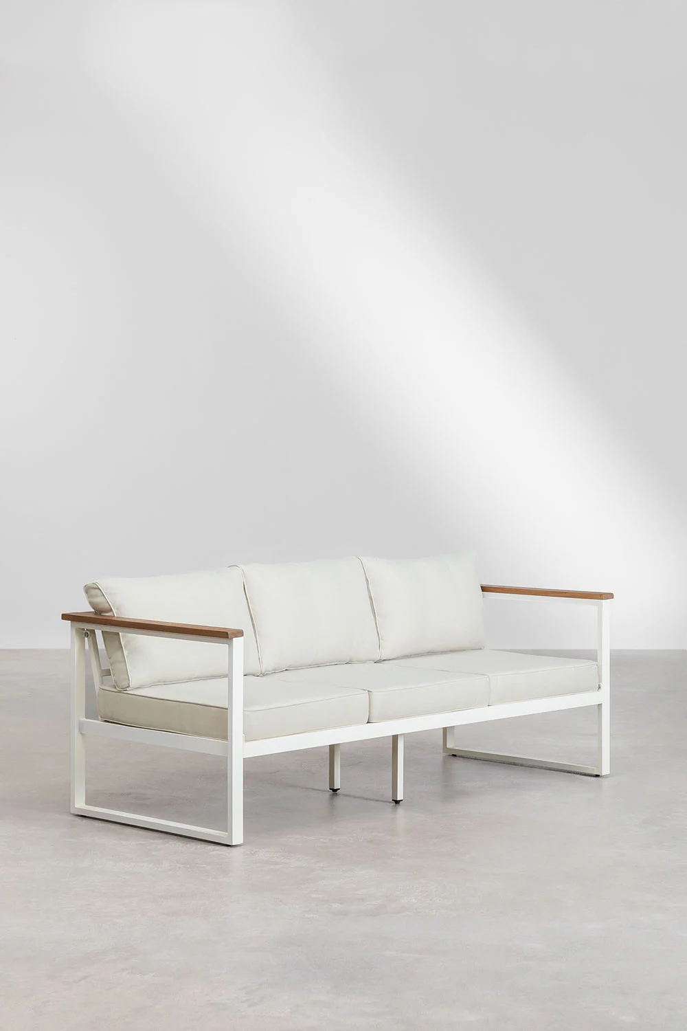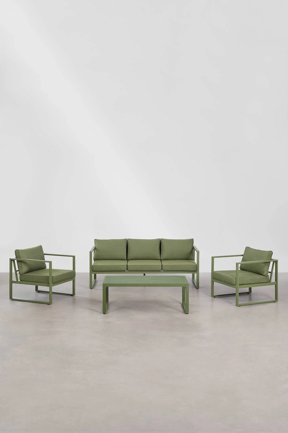 Este conjunto está formado por sofá de 3 plazas, 2 sillones individuales y mesa de centro, ofreciendo el equilibrio perfecto entre funcionalidad y confort. Su estructura de aluminio lo hace ligero, resistente y perfecto para exteriores, mientras que sus cojines acolchados aportan esa comodidad que invita a alargar cualquier sobremesa.