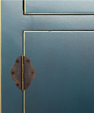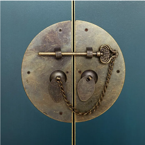 Dos puertas centrales con herraje oriental que ocultan un compartimento para objetos de mayor tamaño.