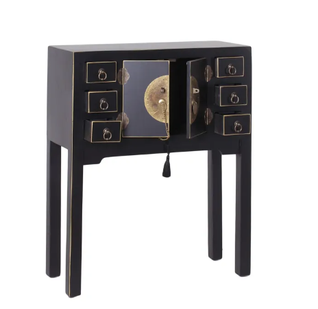 Con un diseño inspirado en el mobiliario clásico asiático, esta consola de la colección permanente Oriente combina estructura íntegra de DM lacado en negro satinado con delicados herrajes metálicos en acabado latón. Sus seis cajones frontales (10 × 23 × 7 cm) resultan perfectos para organizar objetos pequeños, mientras que las dos puertas centrales ocultan un práctico compartimento para libros o vajilla.