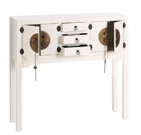 Esta consola de la colección permanente Oriente combina la pureza del acabado blanco con herrajes de inspiración oriental. Fabricada en DM lacado, ofrece gran capacidad de almacenaje en apenas 26 cm de fondo, perfecta para recibidores, comedores o pasillos.