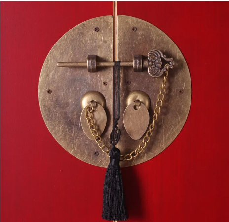 Cuatro puertas con cierre de herraje oriental que protegen un compartimento amplio para vajilla, mantelería o pequeños equipos electrónicos.
