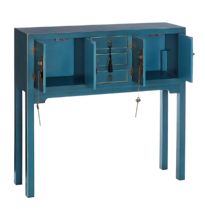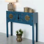 Esta consola de la colección permanente Oriente combina la fuerza decorativa del color azul con un diseño de inspiración oriental. Fabricada en DM lacado, ofrece amplio espacio de almacenaje sin renunciar a un fondo estrecho (26 cm), ideal para recibidores y salones.