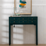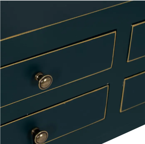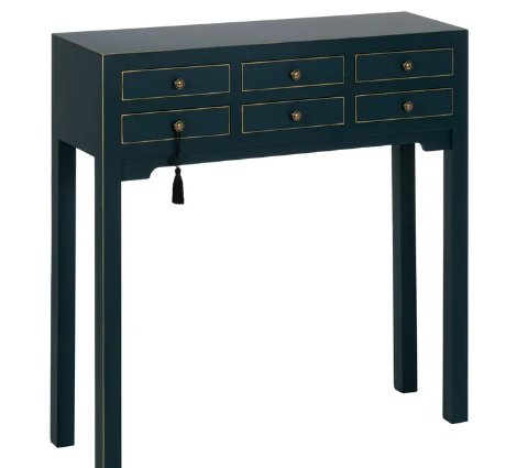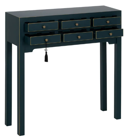 Con un acabado azul intenso y líneas depuradas, esta consola de la colección Oriente combina un cuerpo de DM lacado con patas de abeto de 60 cm que estilizan la pieza y facilitan la limpieza.