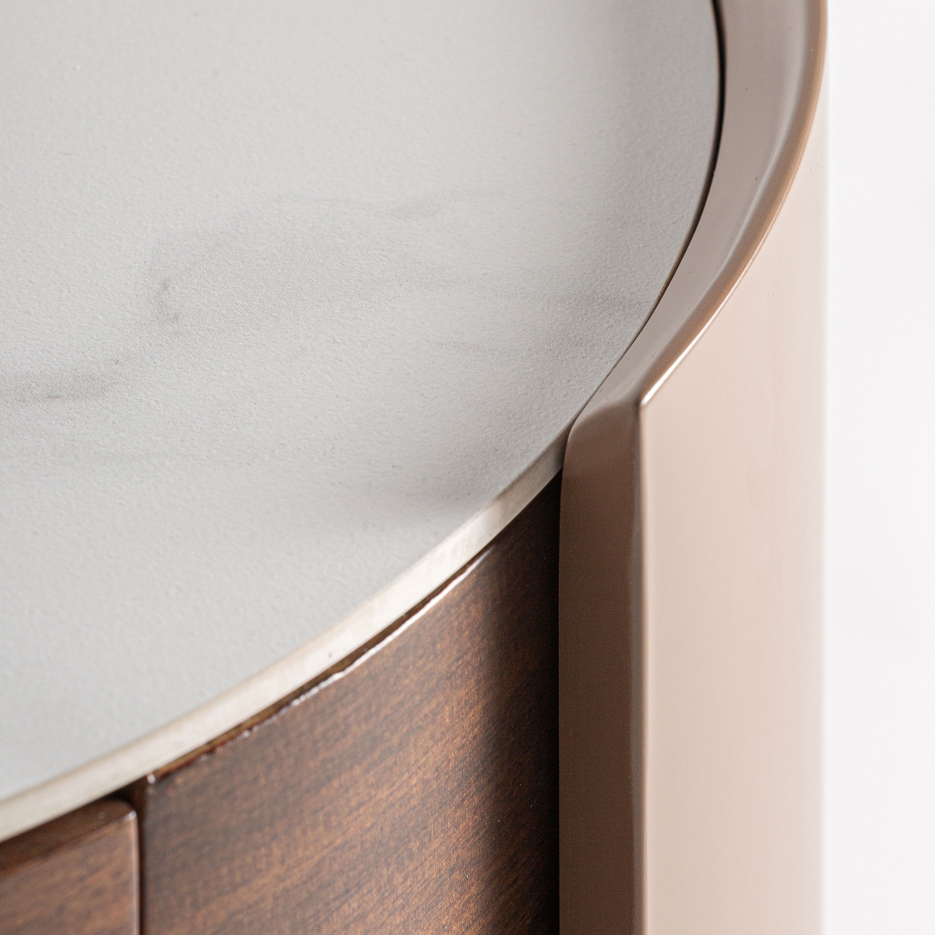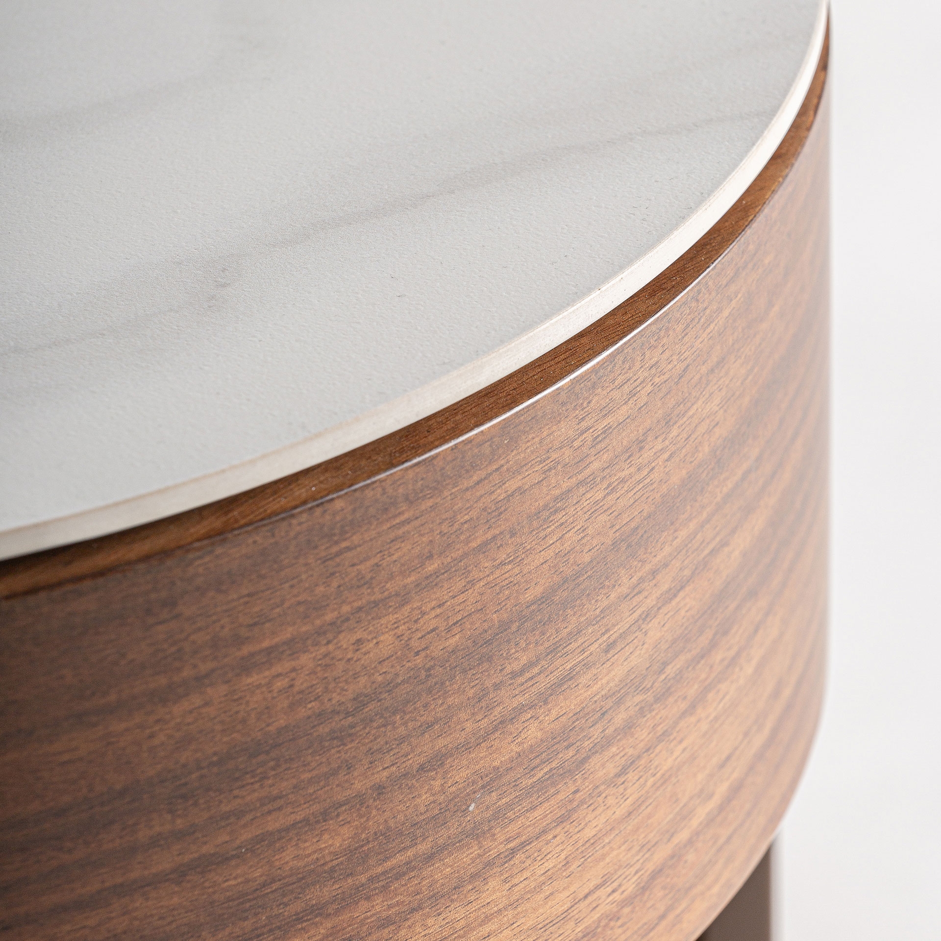 Este diseño de VICAL aporta equilibrio y estilo: la mesita de noche Giswil. Su estructura en madera contrachapada marrón, chapa de eucalipto clara y piedra sinterizada blanca crea una pieza funcional con carácter natural.