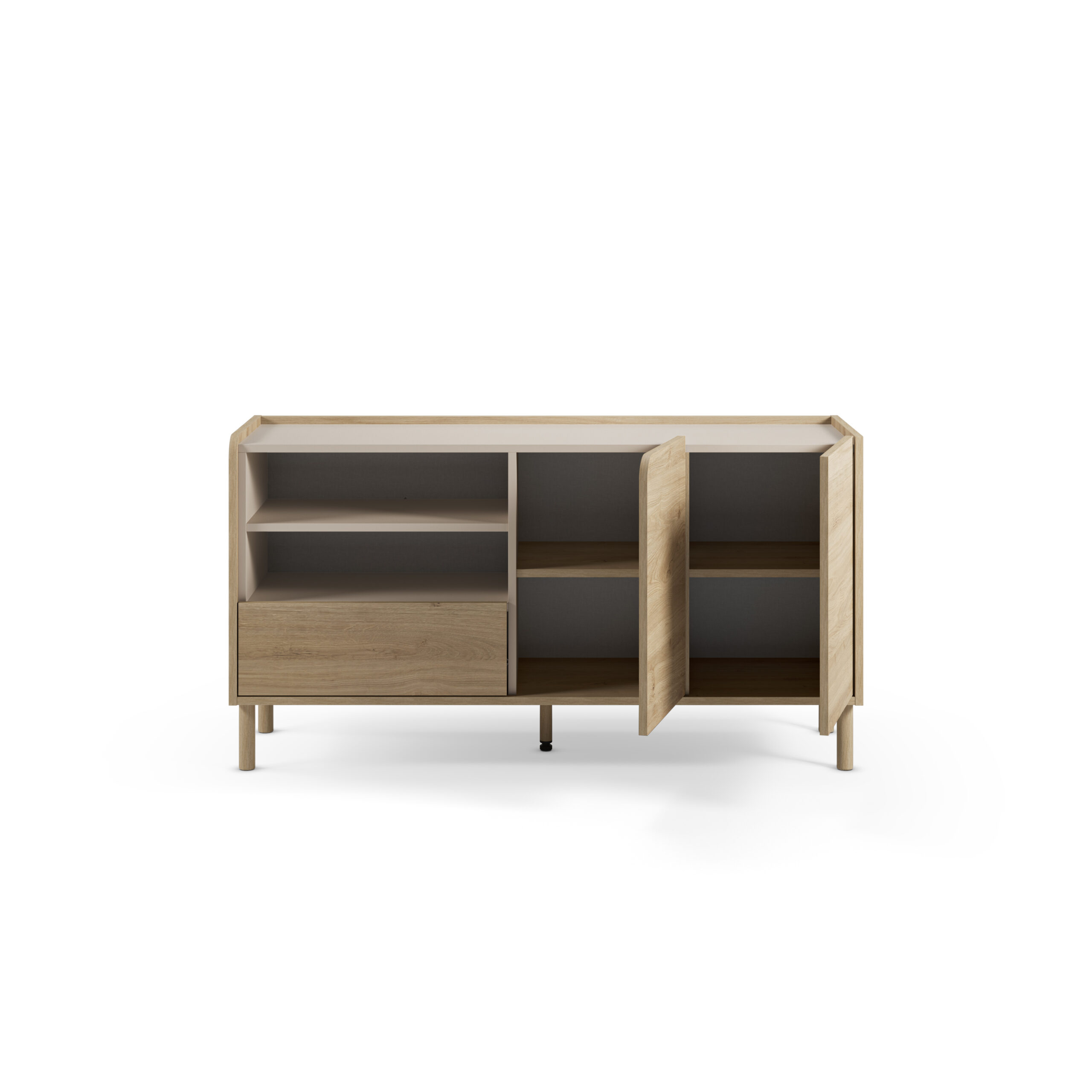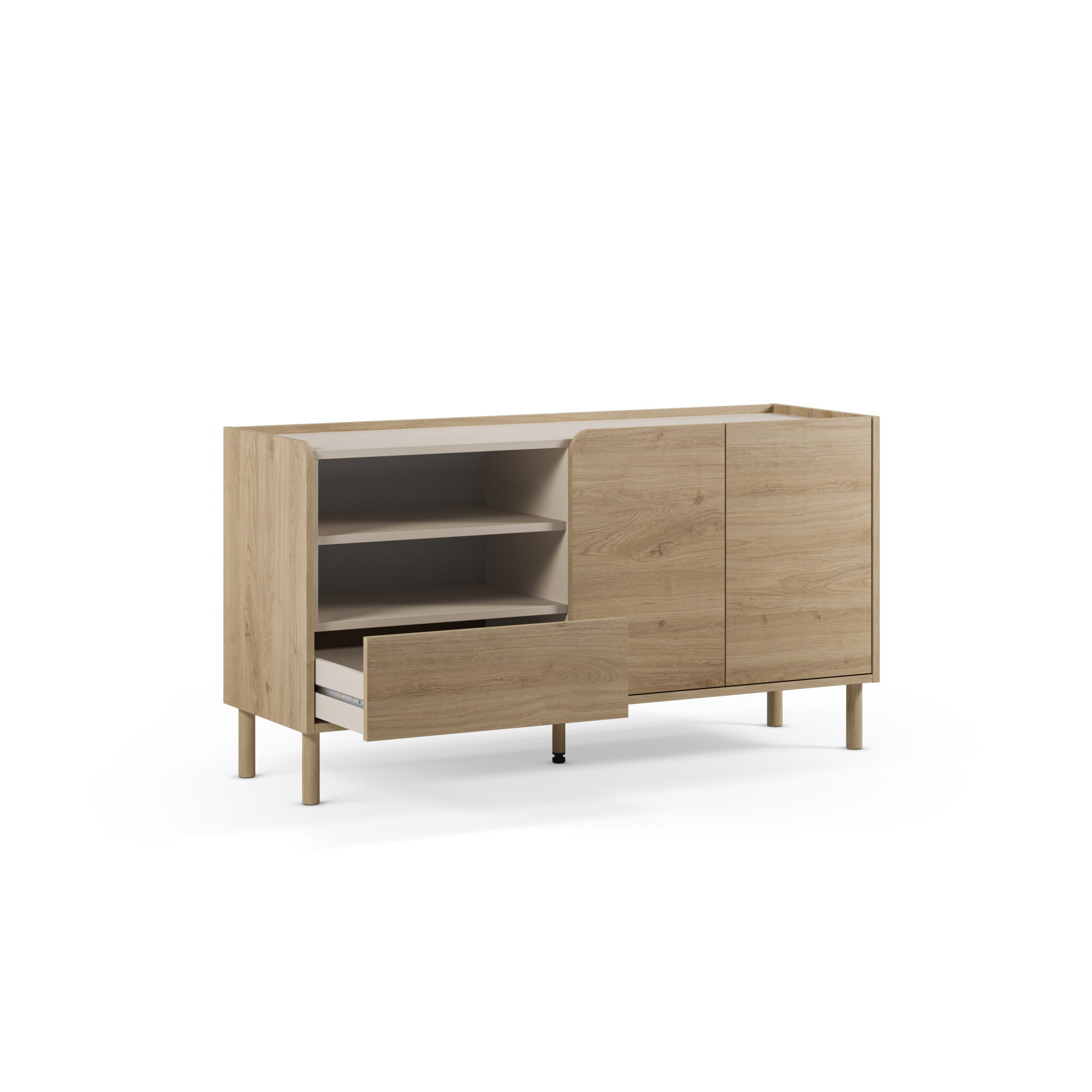 Fabricado en melamina de madera en tono natural con tapa superior y detalles en lacado visón.