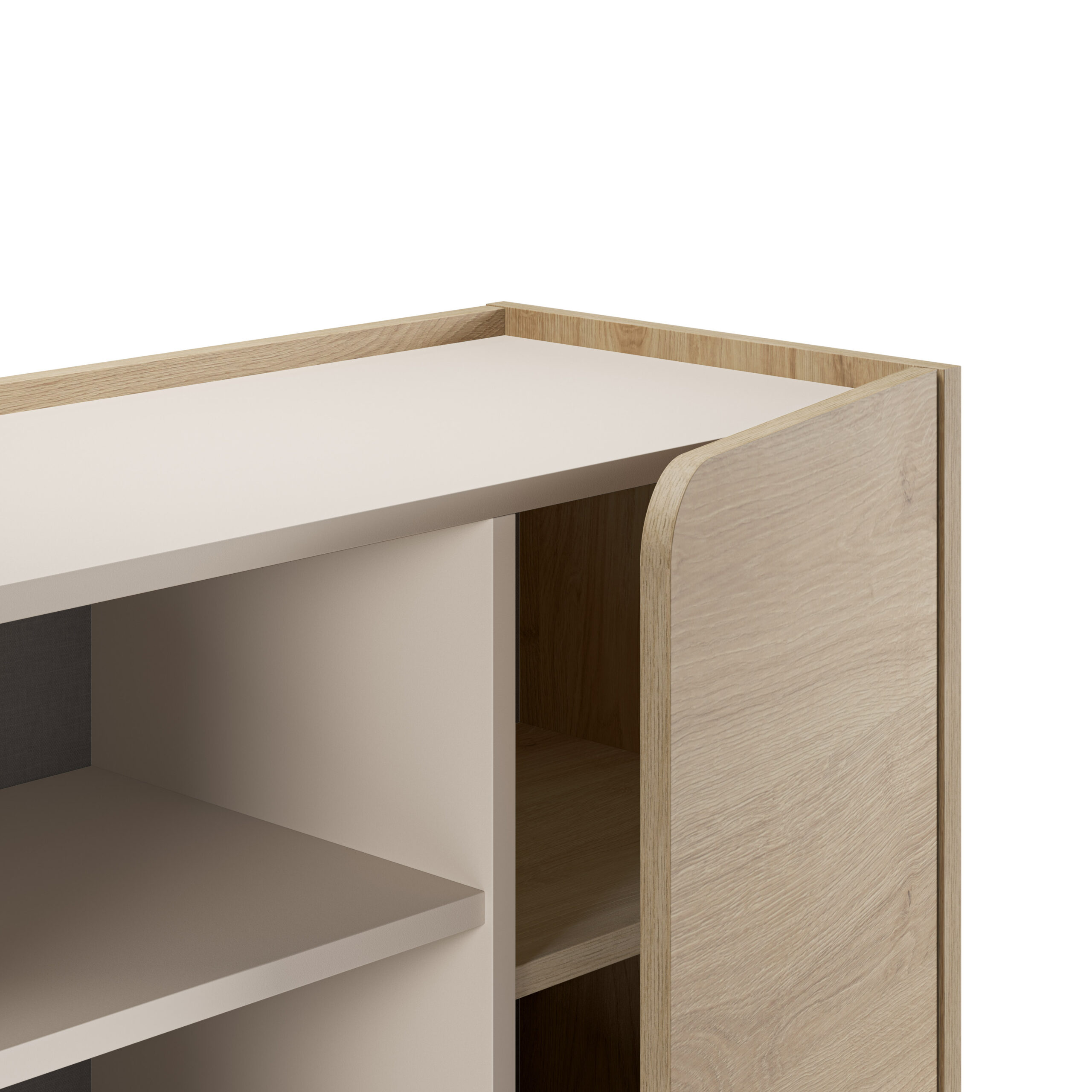Fabricado en melamina de madera en tono natural con tapa superior y detalles en lacado visón.