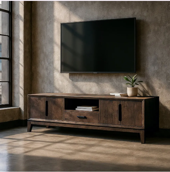 El mueble de TV marrón de madera de mango combina funcionalidad y estilo natural para tu salón. Fabricado con madera maciza de mango, ofrece una estructura sólida y un diseño atemporal que destaca por su calidez y elegancia.