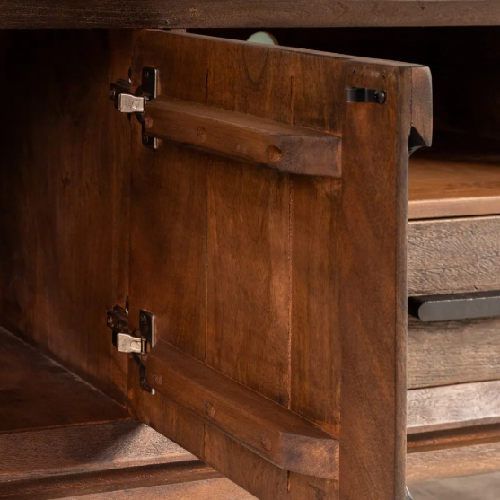 Mueble TV de la colección Kilian fabricado en madera maciza de mango con acabado marrón. Incluye dos puertas, un cajón central y patas elevadas. Ideal para salones modernos y naturales.
