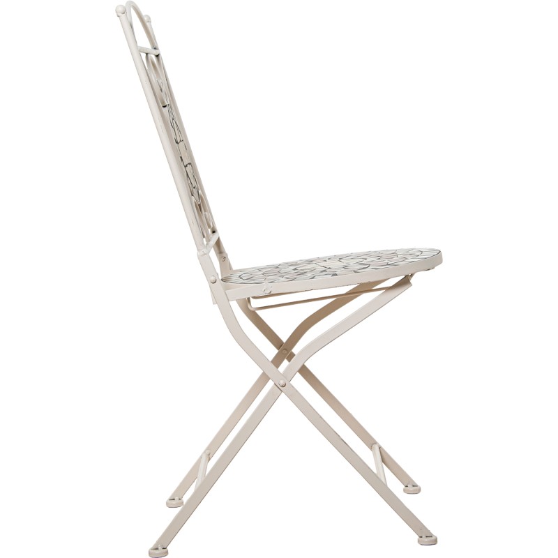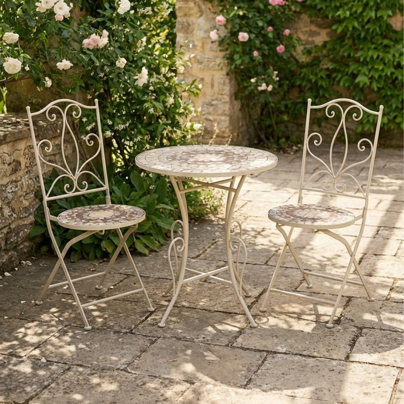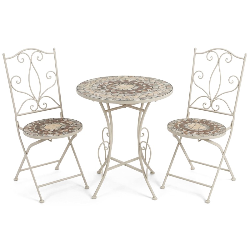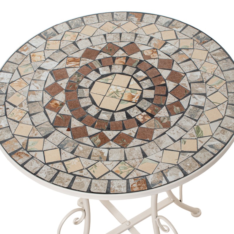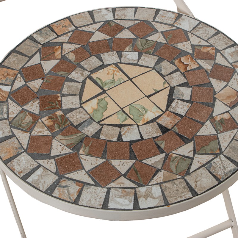 La mesa redonda de 60 cm de diámetro es compacta y funcional, proporcionando el espacio justo para disfrutar de desayunos al sol o momentos de lectura. Las sillas, con su diseño ergonómico y decorativo, incorporan el mismo motivo de mosaico en el asiento y el respaldo, manteniendo una coherencia estética impecable. Gracias a su sistema plegable, las sillas ofrecen una versatilidad total, permitiendo guardarlas cómodamente para despejar la zona cuando sea necesario.