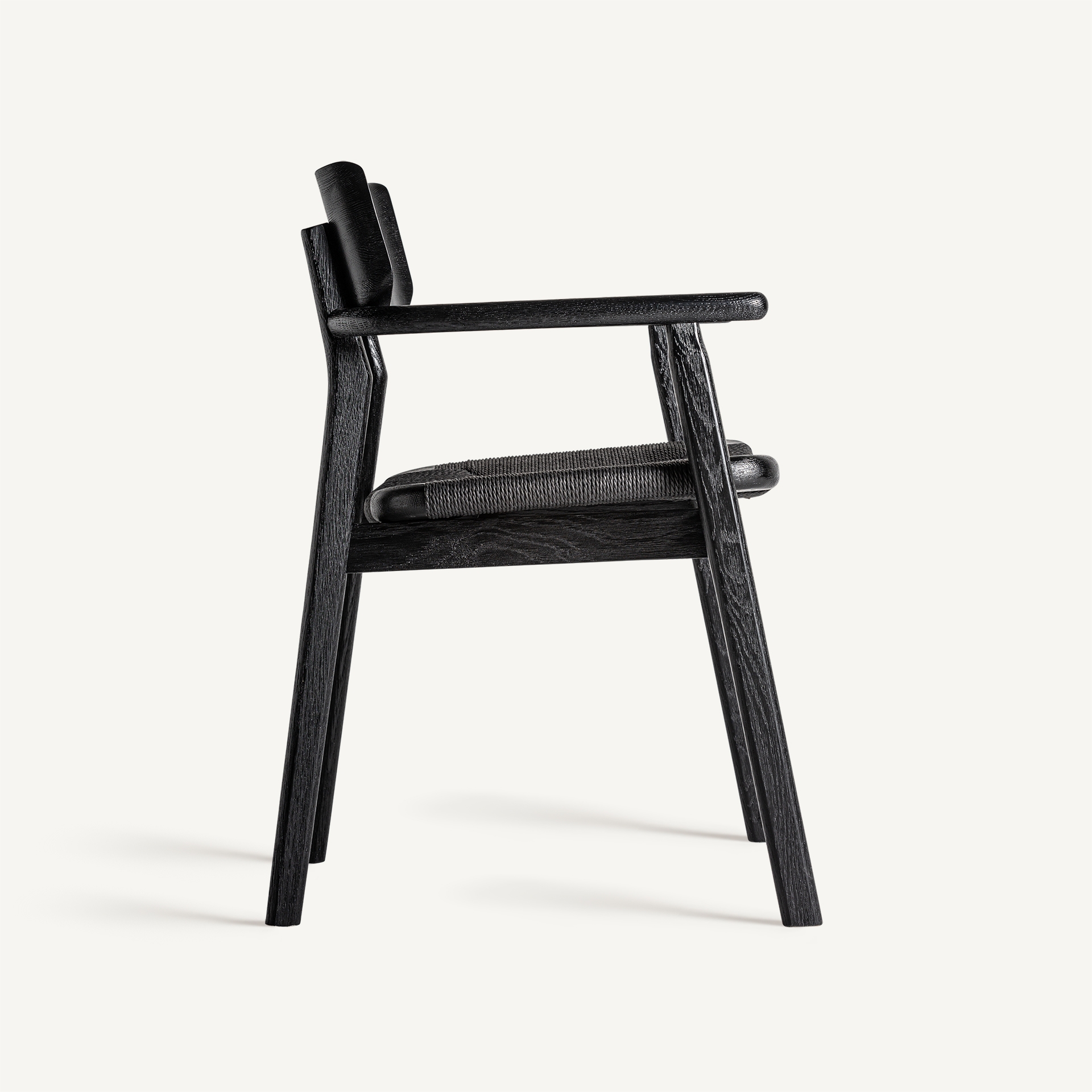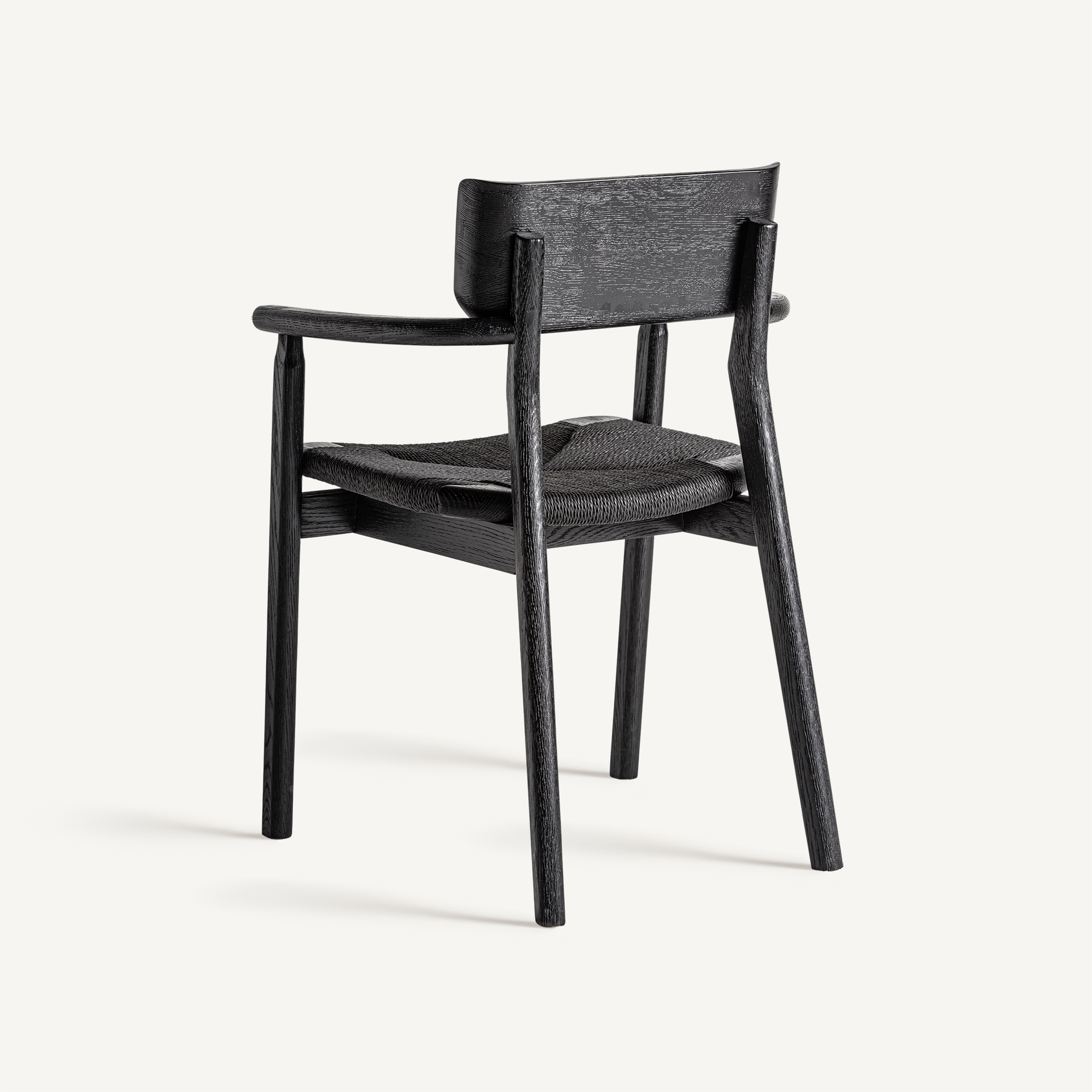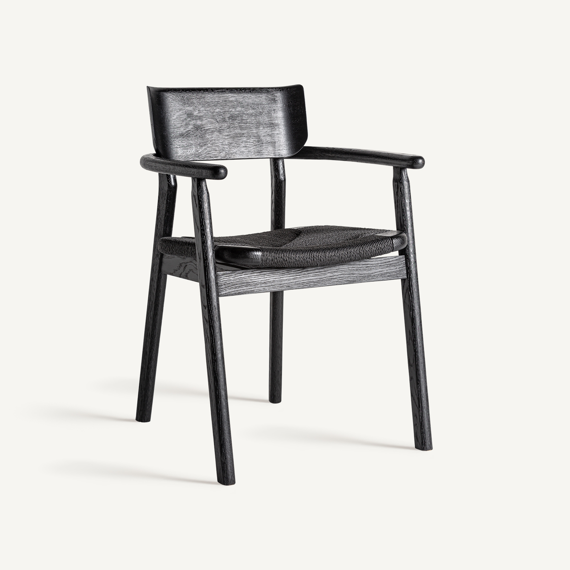 Este diseño de VICAL aporta calidez y estilo: la silla Tasque. Su estructura en roble negro mate y asiento de fibra natural negra crean un contraste visual que realza cualquier ambiente.