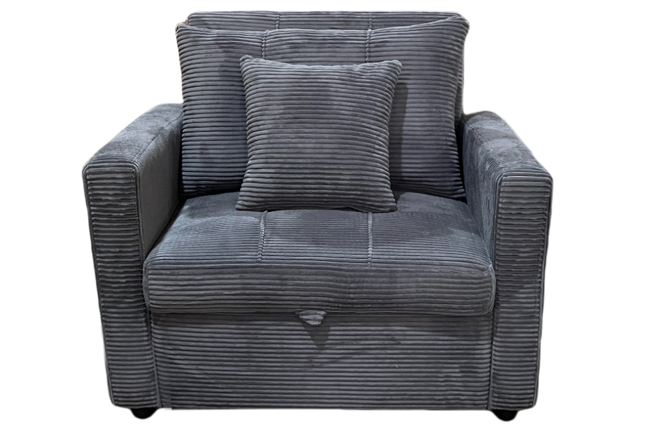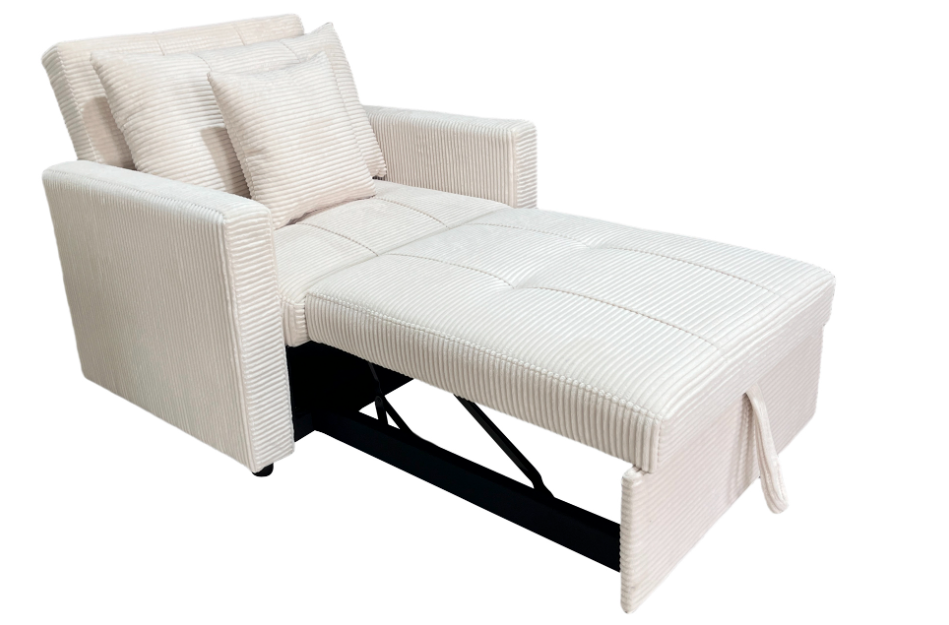 Sofá cama individual tapizado en corduroy, con respaldo reclinable y reposapiés extensible. Funciona como sillón, chaiselongue o cama supletoria (80 × 197 cm). Disponible en color gris y crema.