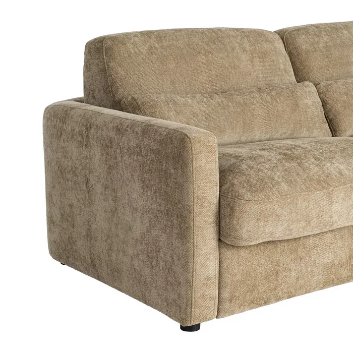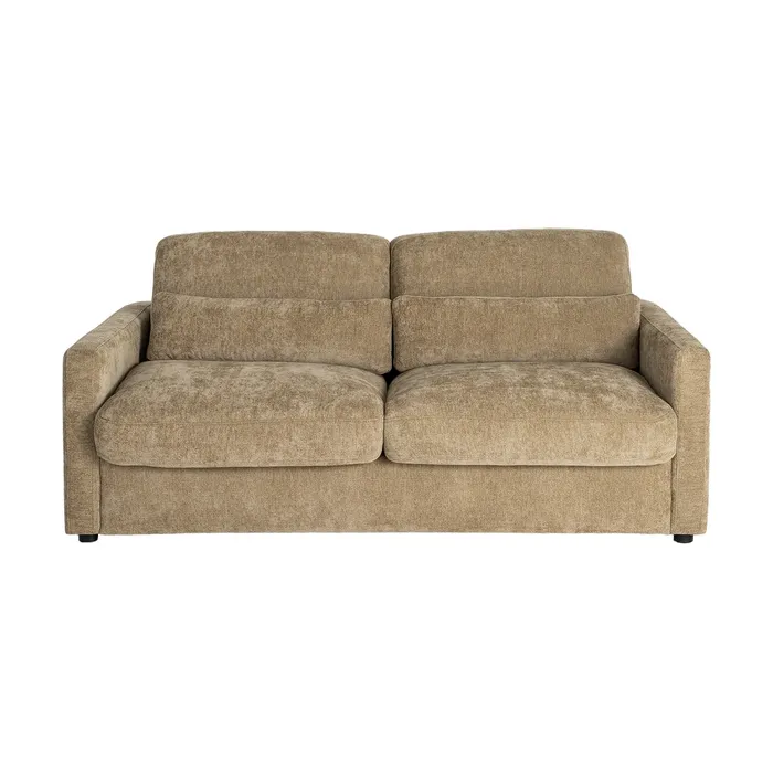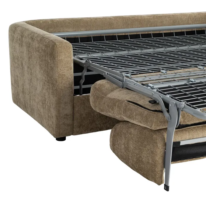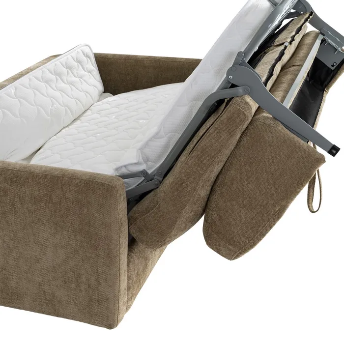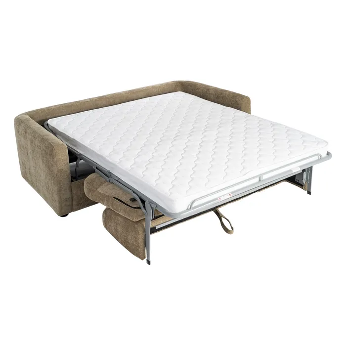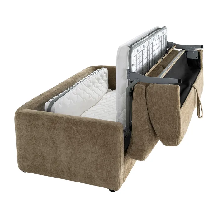 Práctico y cómodo sofá cama de diseño atemporal con sistema de apertura italiano que le proporciona una gran facilidad de uso. Con la ayuda de una discreta y práctica cinta, el respaldo y la cabecera se deslizan hacia adelante, transformándose en la base del colchón. Así, en apenas unos segundos.