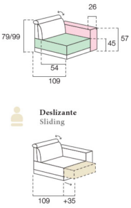 - Este sofá se puede fabricar en otras medidas y tapizados. También en su versión fija. No obstante, no se recomienda mezclar diferentes mecanismos (fijo, relax, deslizante), pues con el paso del tiempo, habrá una diferencia estética entre ambos asientos.